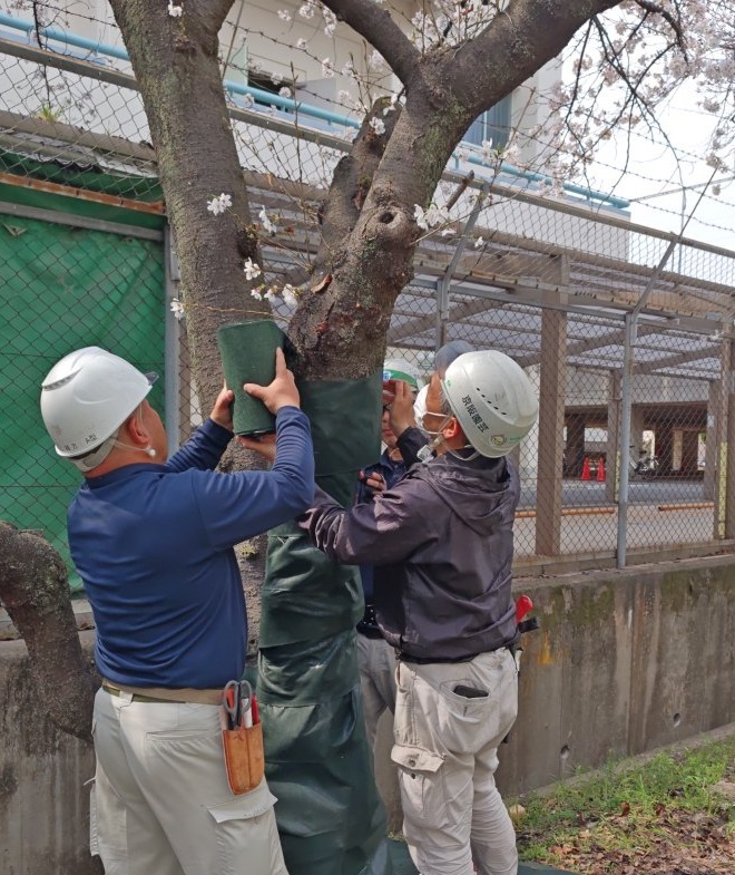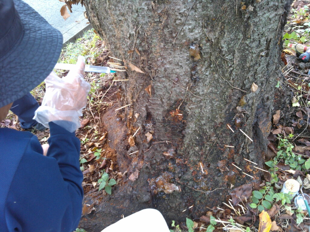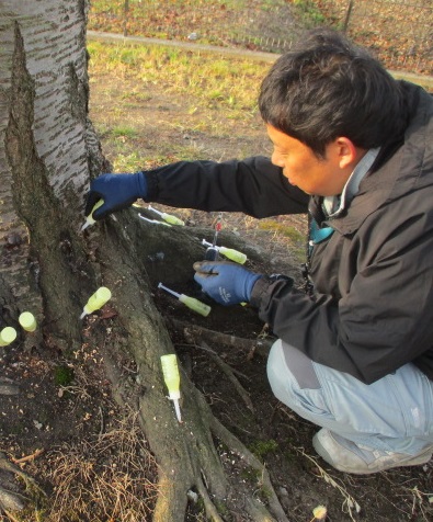 弊社ではクビアカツヤカミキリの防除対策として、(1)幼虫駆除のための樹幹薬剤注入 (2)成虫・卵防除のための薬剤散布 (3)防除シート設置を行っています。