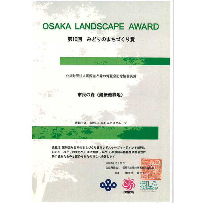 市民の森(鏡伝池緑地)が「第10回みどりのまちづくり賞(大阪ランドスケープ賞) 公益財団法人国際花と緑の博覧会記念協会会長賞」を受賞