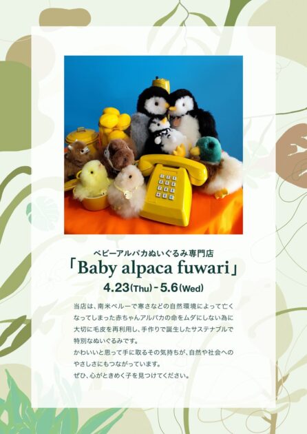 2026年4月23日(木)から5月6日(水・祝)まで、GO GREEN GALLERY店頭にて、今回3回目となる「Baby alpaca fuwari」展を行います。