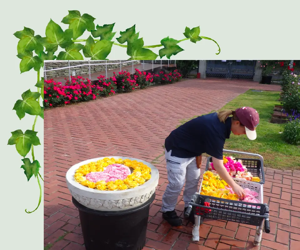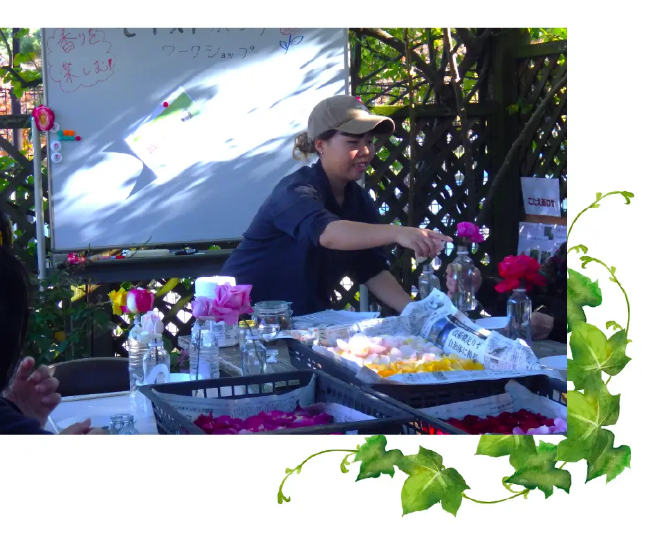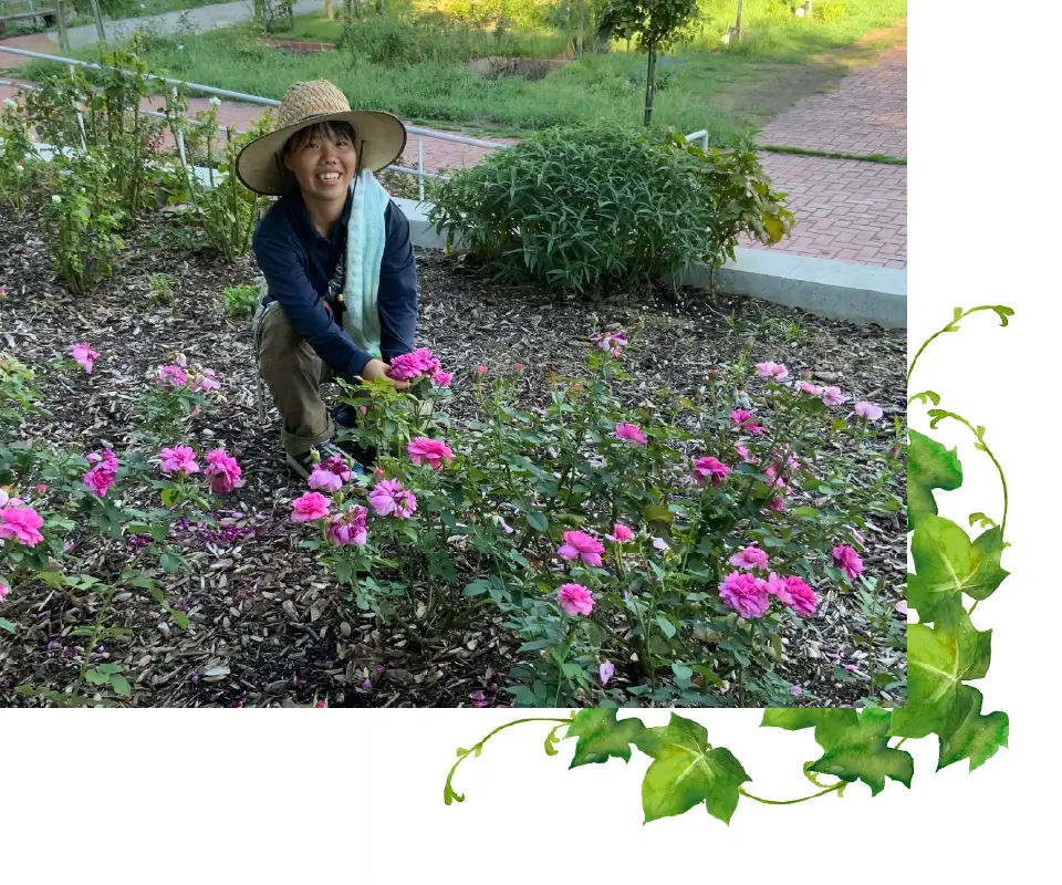 ・自分が植えた花壇や管理しているバラ園を見てくれた人に直接感謝の言葉をいただいたり、笑顔がみれること。 ・植物と身近に関われるため、植物の専門知識が身に着くこと。 ・珍しい虫や鳥などの生き物を見つけることができること。 ・得意なことを活かすことができること。
